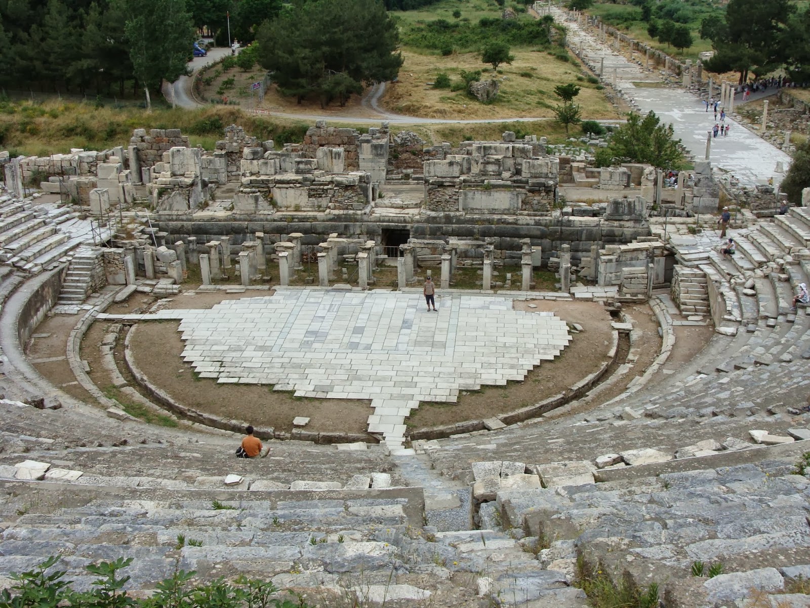 Ephesus é um museu a céu aberto com um anfiteatro enorme, outro pequeno, a fachada inteira da biblioteca de Celsus, ruas, pedras restantes de casas, algumas colunas e muito pedaço de mármore no chão. Entramos pelo portão de baixo e o homem na entrada ficava oferecendo uma van para nos levar ate o portão de cima que assim a gente so ia ter que descer. Mas ele ia dar uma passadinha na loja de tapete dele. No, thanks. Fomos por baixo mesmo e enfrentamos os montes de turistas que vinham descendo, mas a subida nem foi tão puxada quanto o homem dizia. So fez calor, muito calor.